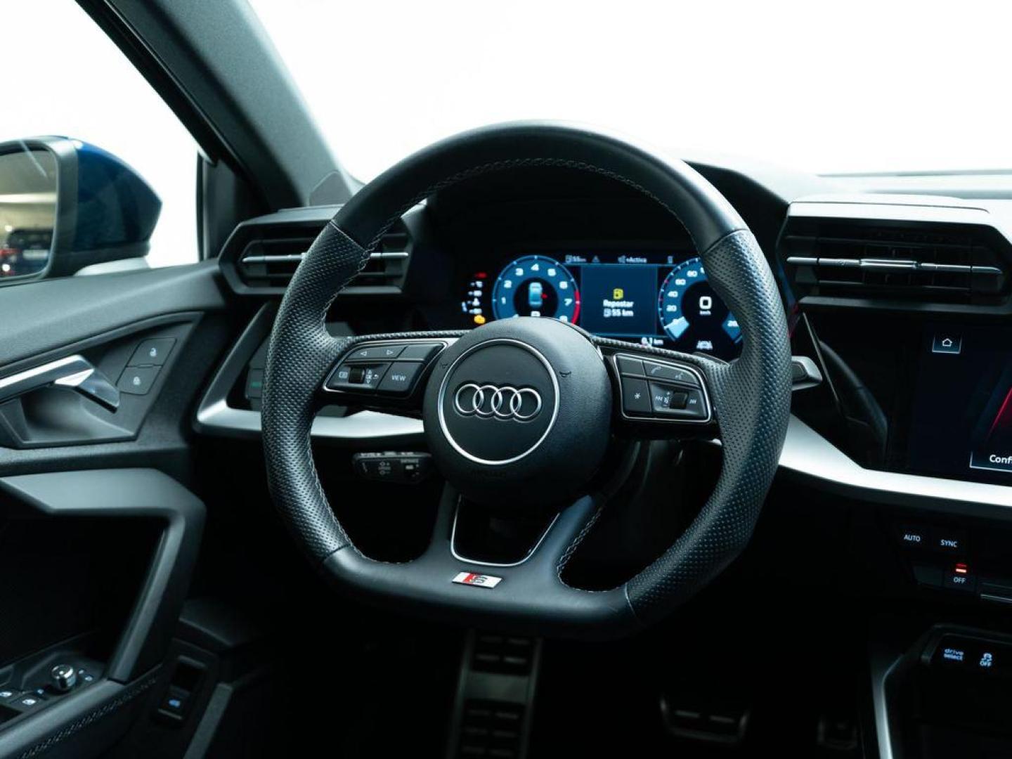 - Volante deportivo de tres radios multifuncional achatado en la parte inferior con levas para el cambio S tronic
